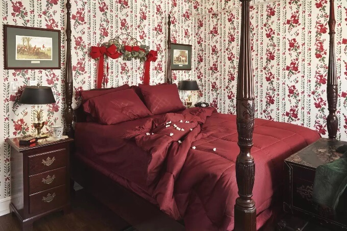 Many people think that beds need white, beige or other neutral colors to appear cozy, but the McCallister’s house proves that’s not true! The bed in the master bedroom has a completely ruby red bedding set, and it looks lovely against the patterned wallpaper with the red flowers.