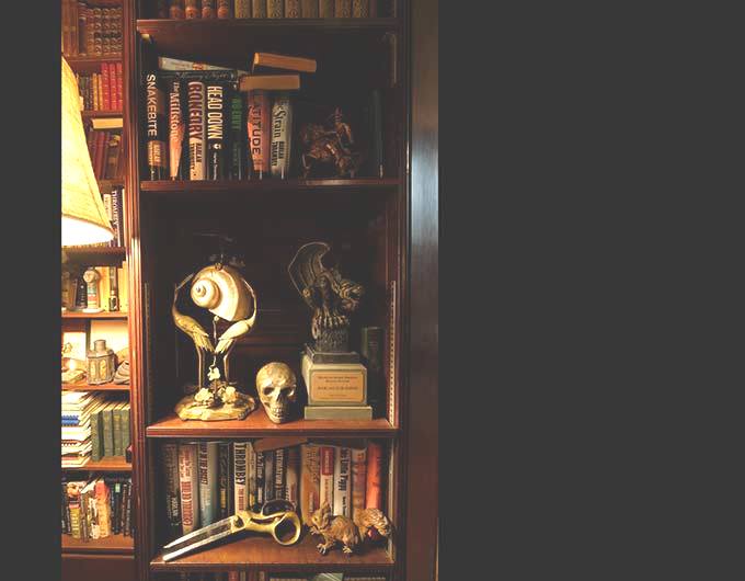 There are many other sculptures throughout the Thrombey home, ranging from the weird to the macabre. We can assume that many of these have been collected during the family’s travels over the years. The art pieces are styled on every available surface – desks, mantlepieces, bookshelves, end tables, coffee tables and more.drawer