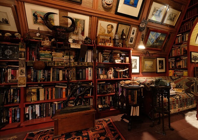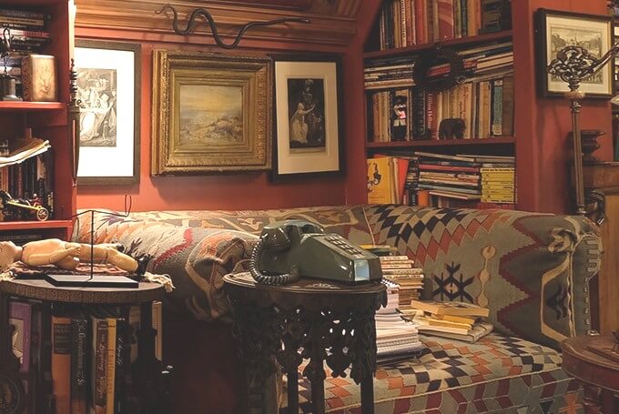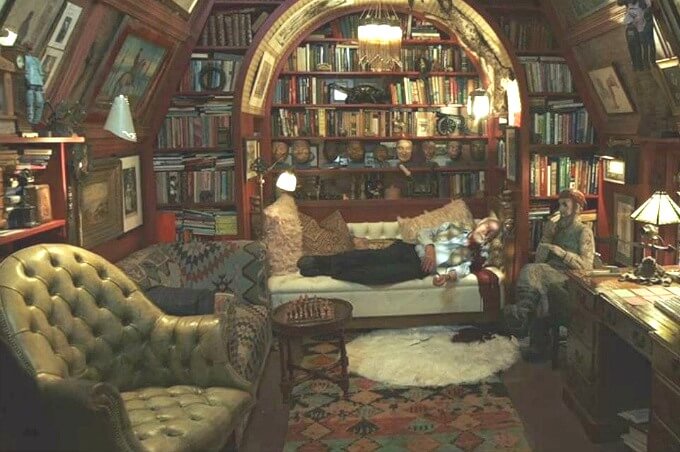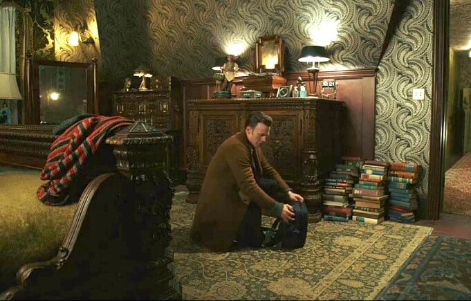 Harlan Thrombey is a famous writer, so it’s natural that he’ll have lots of books in his library. But that’s not all; his bookshelves are styled in a very unique way, with unexpected decor items and odd combinations.