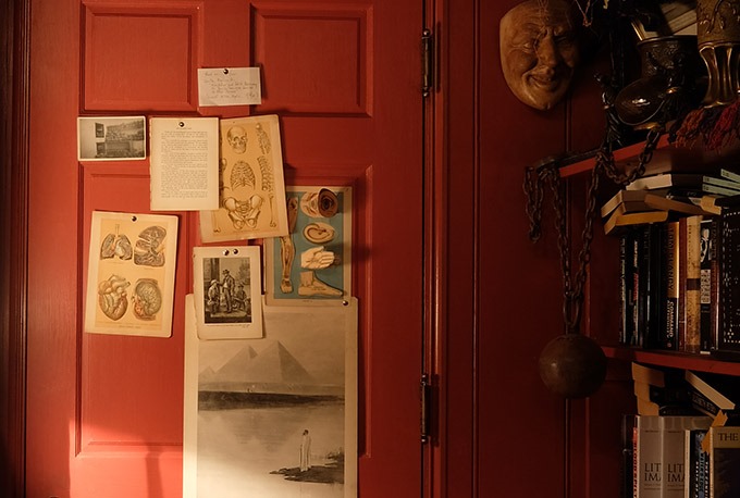 On the other hand, Harlan’s door is another matter altogether. It’s got diagrams, photographs and posters, and these are in no particular order, which speaks of the thought process of a creative mind. We have to assume that the anatomy diagrams are for his murder stories – why else would they be up there?