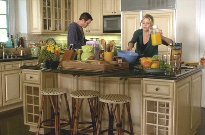 The kitchens in all three homes have kitchen islands, which act as a grounding point in each scene, since the people tend to hang around it. Cam and Mitch got a proper island after their kitchen renovation; before that, they had a kitchen trolley on wheels.