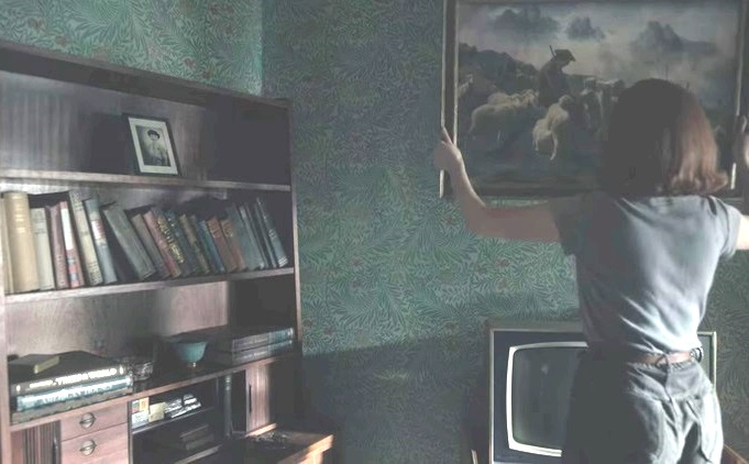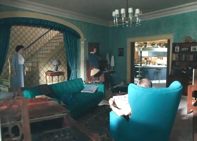 One thing you can’t miss in the show is the deep bluish teal living room of the Wheatleys, Beth’s adoptive family. The curtains, the wallpaper, the rug, the sofas – the room is absolutely drowning in blue!