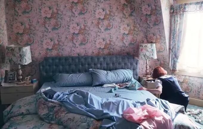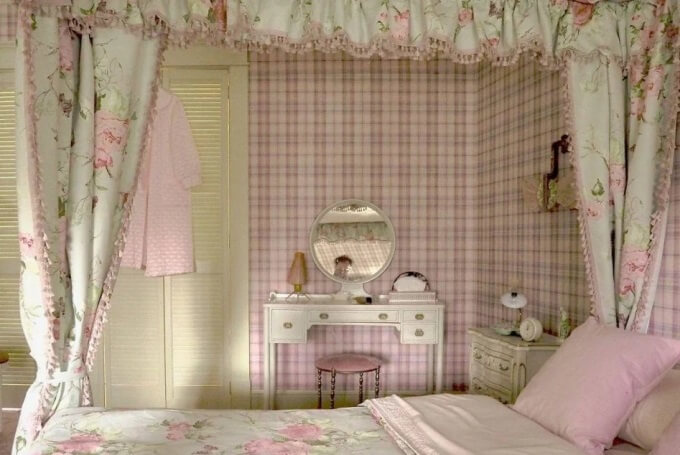 The Wheatleys also use lots of florals, and I mean LOTS! For instance, the bedroom is covered in florals from top to bottom – the wallpaper, curtains, bedding and even lamp shades have florals on them!
