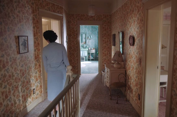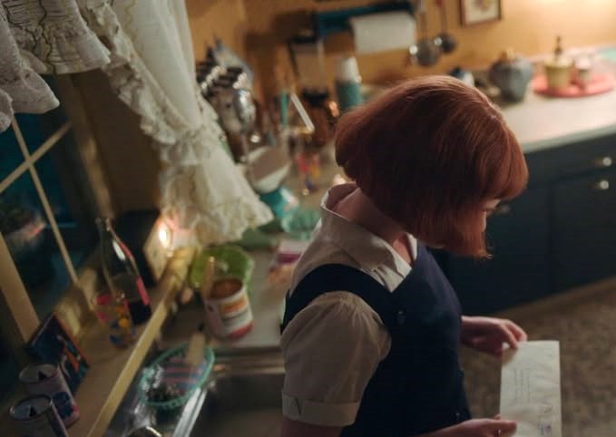 For instance, Beth’s orphanage days show dark walls, which transform to bright colors as she enters her new home. Beth’s adoptive Mom was expecting a girlie girl, due to which she set up a room drenched in pink gingham wallpaper. As Beth moves across cities, the wallpapers change, becoming edgier over time, with more geometric shapes and deeper colors.