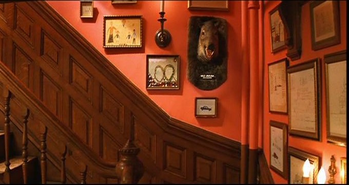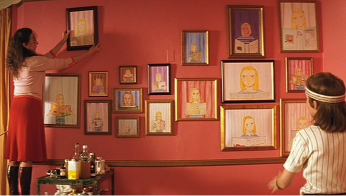 But pink isn’t only on the walls – it’s scattered across the movie, becoming the family’s trademark color. The older members of the family and the houseman wear the same shade in their clothing. The Tenenbaum children, however, have their own characteristic colors, showing how they’re in their own little worlds.