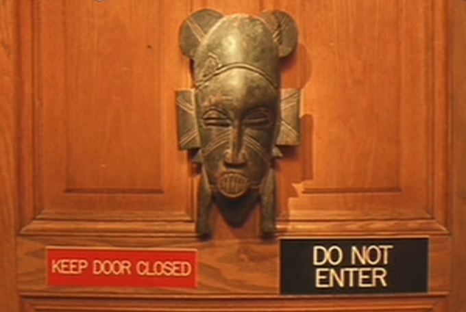 Etheline’s office has many frames featuring African people in traditional clothing. African masks are everywhere, with a large prominent one hanging on the door of Margot’s room. The aged appearance of these masks creates a nice contrast with all the retro tech, mixing both worlds seamlessly.
